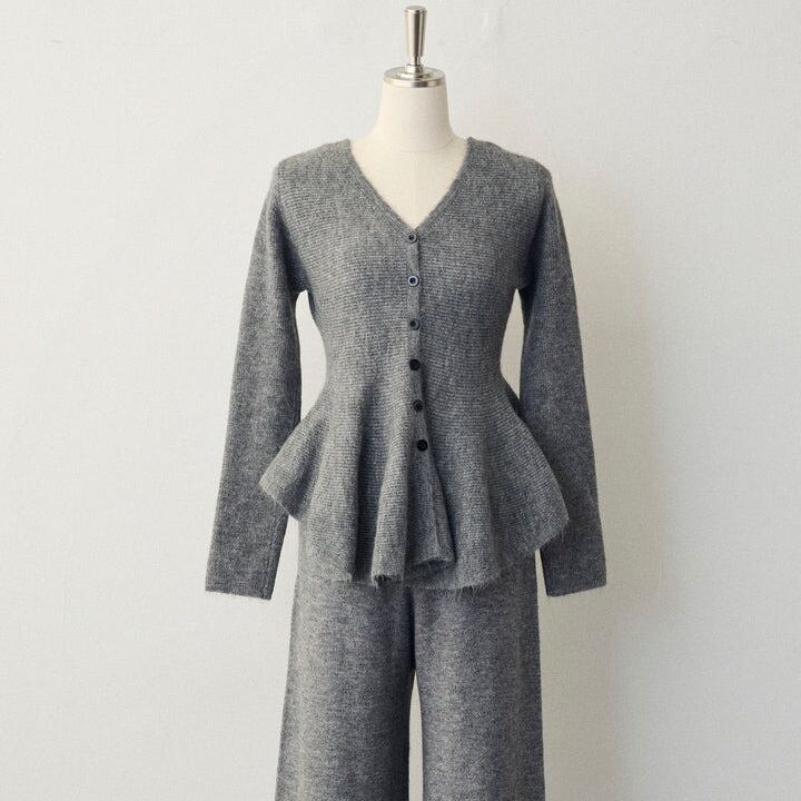 このセットアップは、シンプルでありながら洗練されたグレー色が特徴で、スタイルを引き立てる一枚です。ニット素材の心地よい着やすさと、その柔らかな肌触りが魅力です。