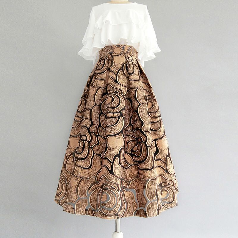 裾に向かって広がるフレアシルエットで、女性らしいラインを演出します。ゴールドの線が、足元をより美しく見せてくれます。ついついおしゃれを楽しみたくなる、魅力的な一枚です。