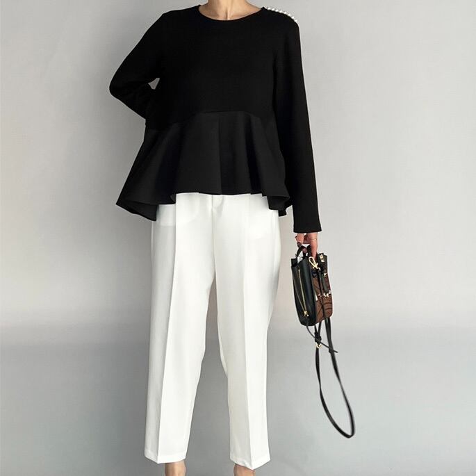 フリルが可愛らしいブラウスと、さらりとした素材感のセーターが合体した一枚。
