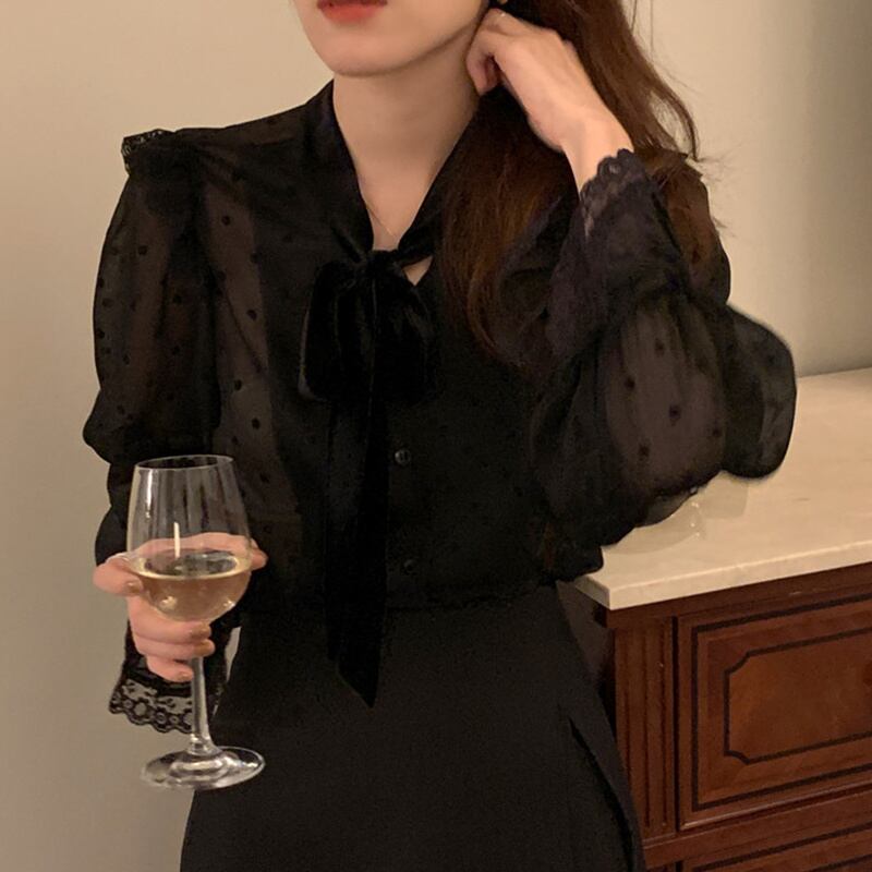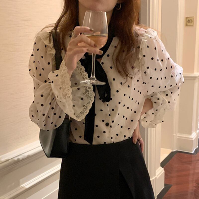 シフォン ドットブラウスは、女性らしいフリルリボンがポイントの一枚です。