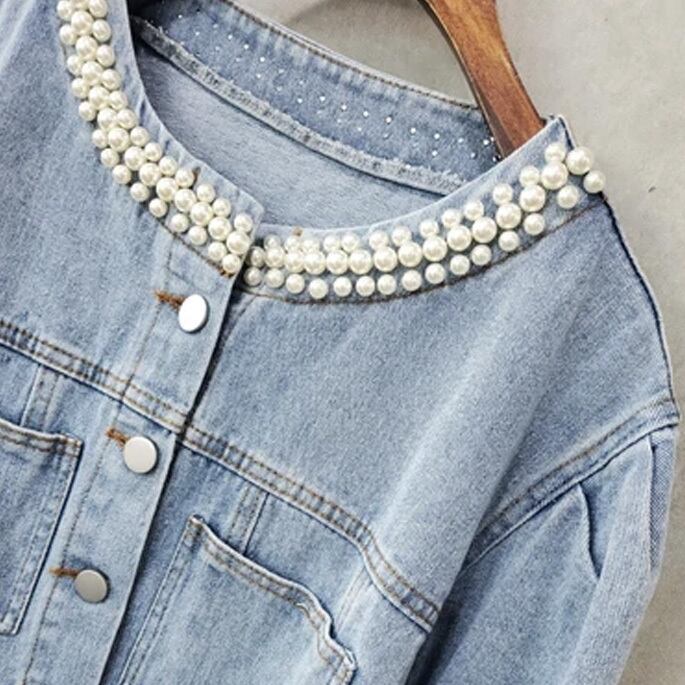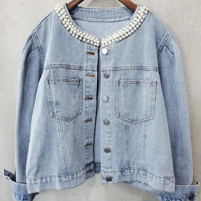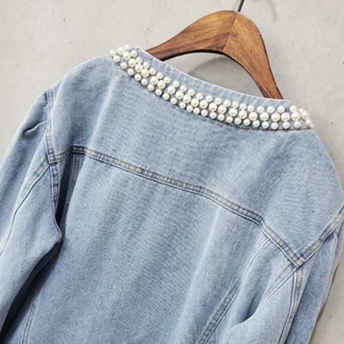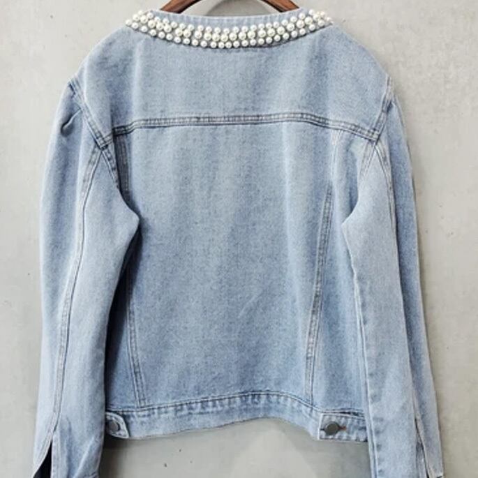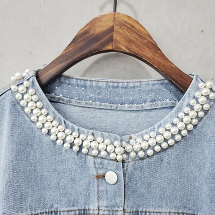 ネックラインのパールがエレガントな印象のデニムジャケットです。