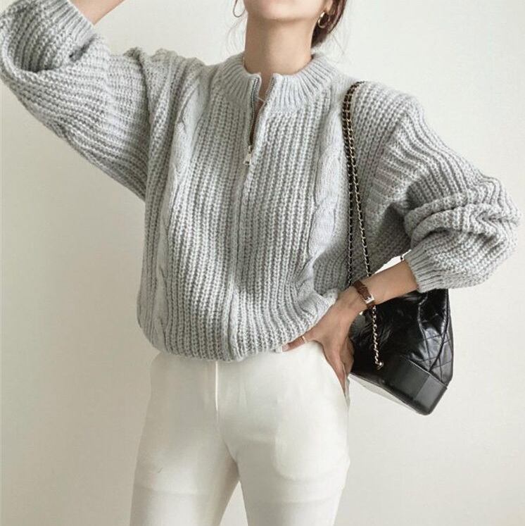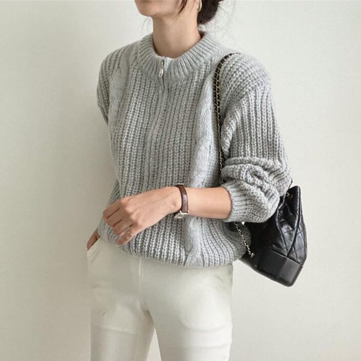 このニットセーターは、忙しい朝のコーディネートにも大活躍。